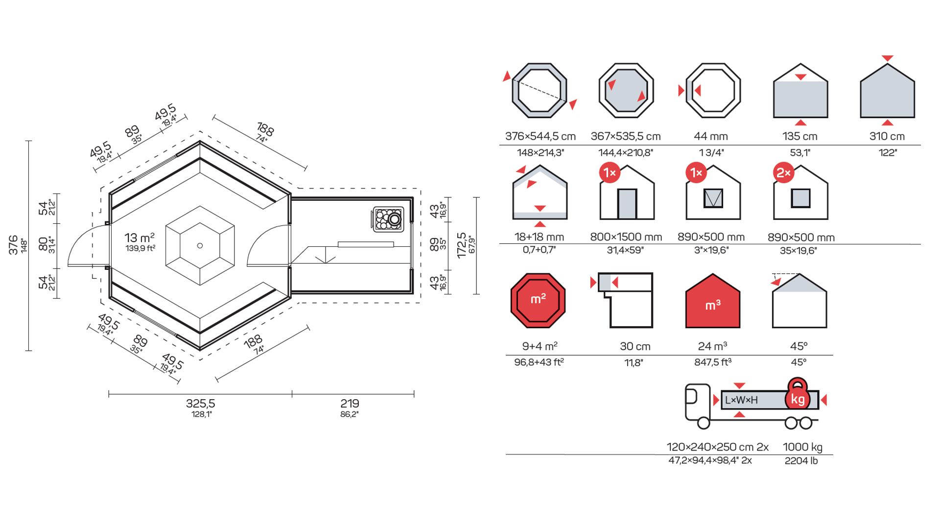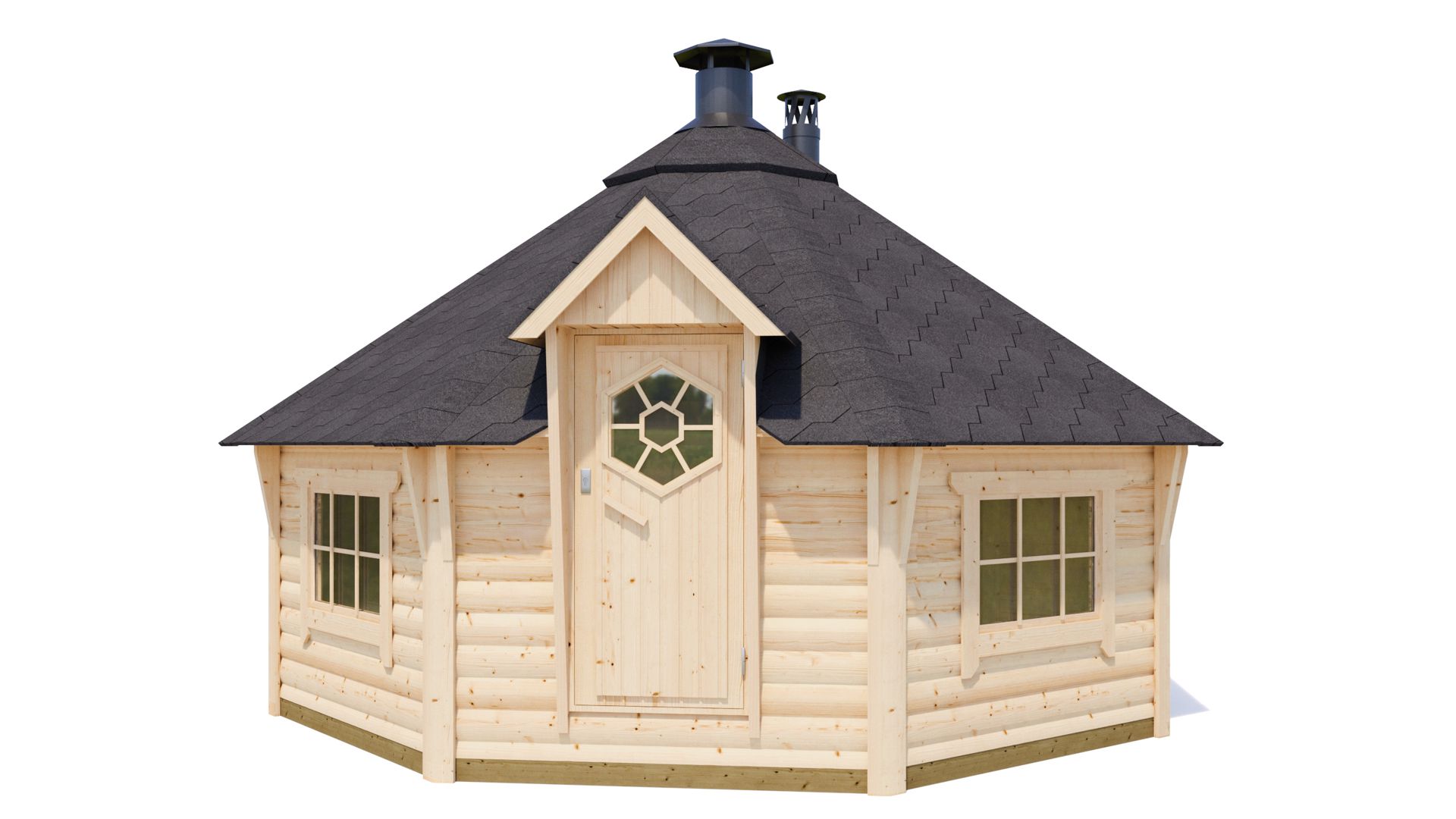 Vse lesene žar hiše 44 mm, vsebujejo standardni komplet: vrata, okna in opremo za