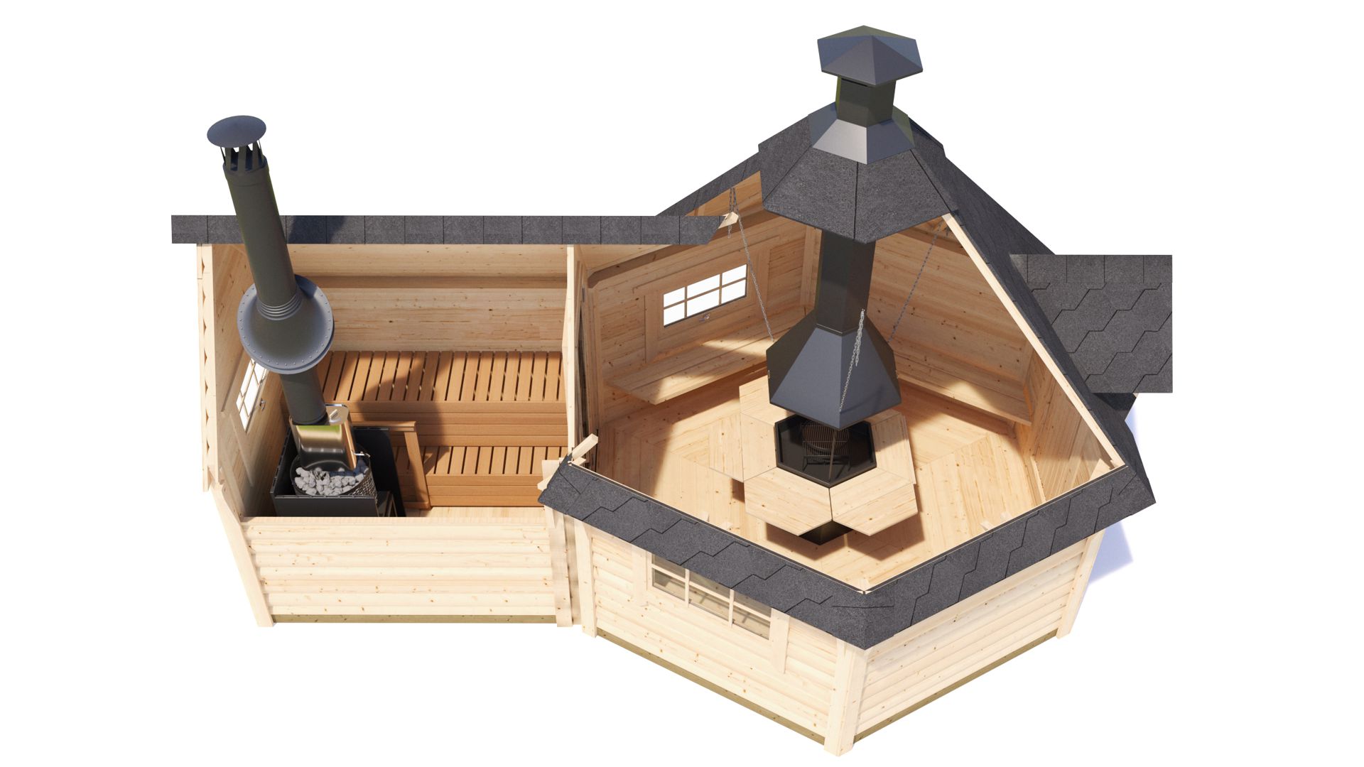 Komplet lesenih hišic za žar debeline 44 mm vsebuje: