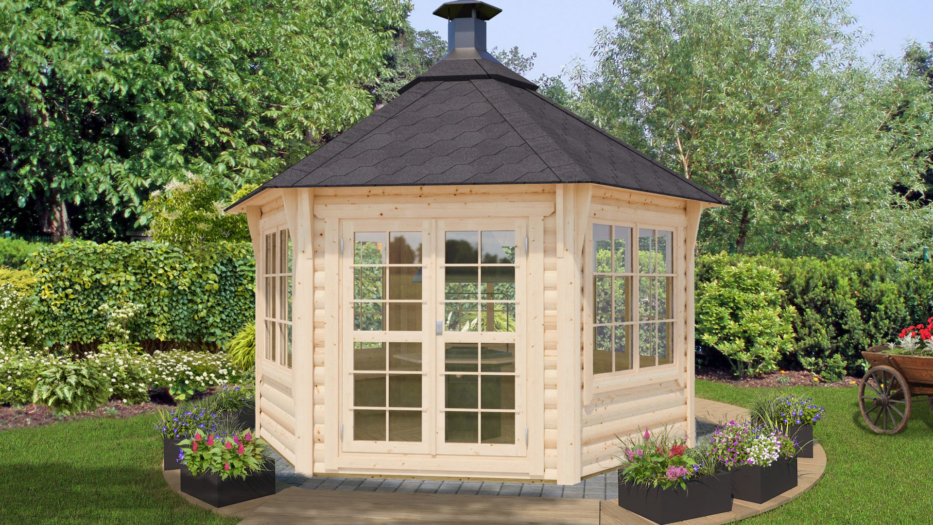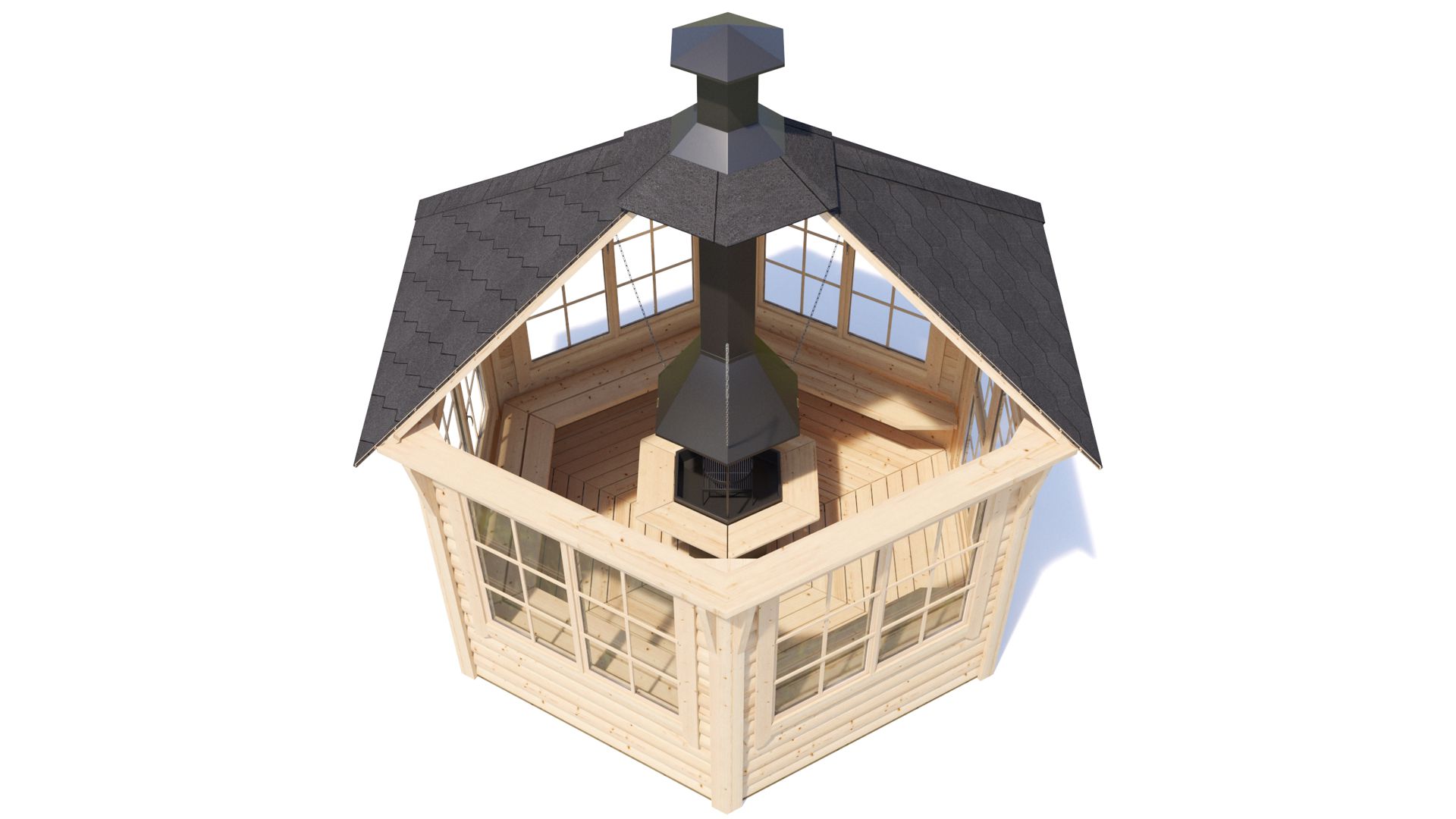Komplet lesenih hišic za žar debeline 44 mm vsebuje: