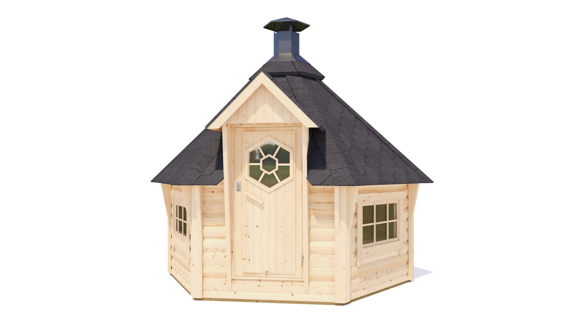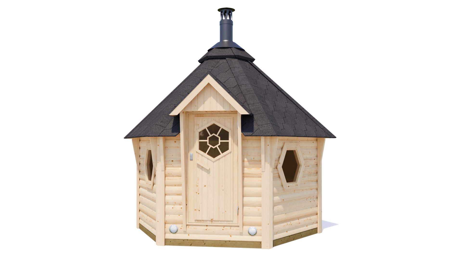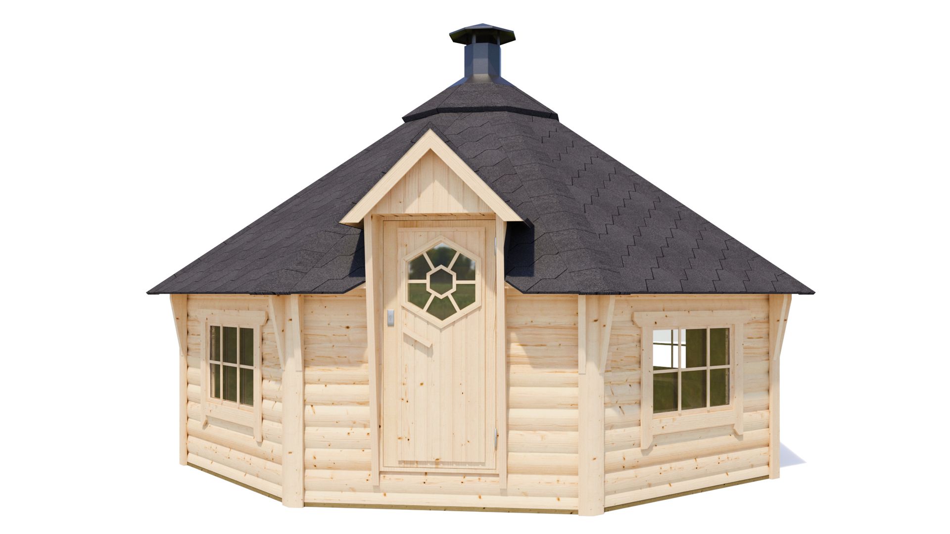 Vse lesene žar hiše 44 mm, vsebujejo standardni komplet: vrata, okna in opremo za