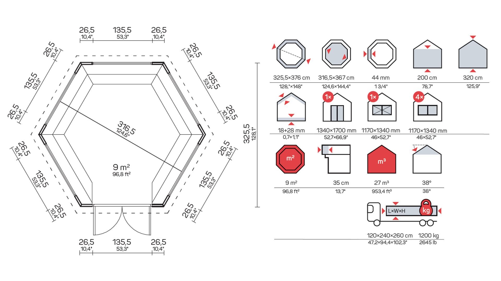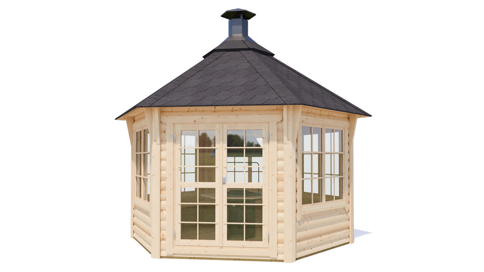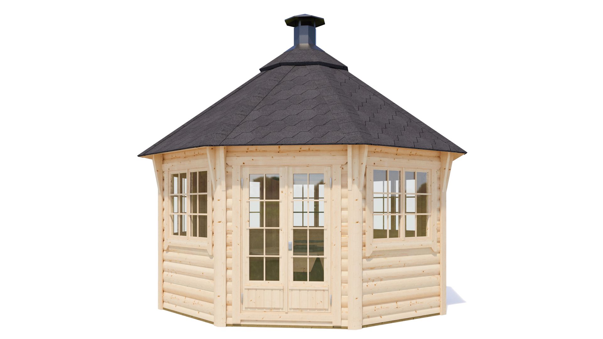Vse lesene žar hiše 44 mm, vsebujejo standardni komplet: vrata, okna in opremo za