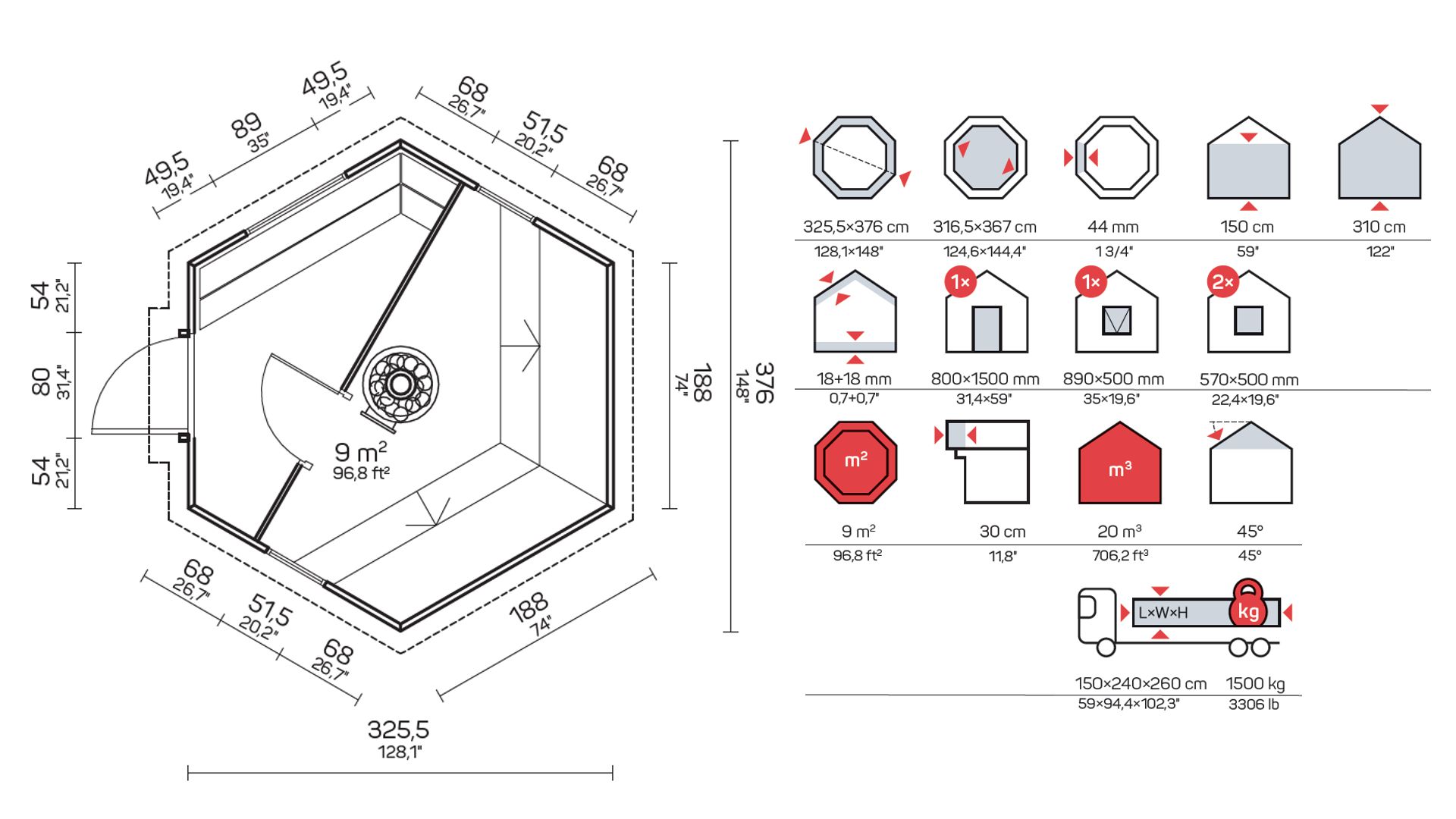 Vse lesene žar hiše 44 mm, vsebujejo standardni komplet: vrata, okna in opremo za