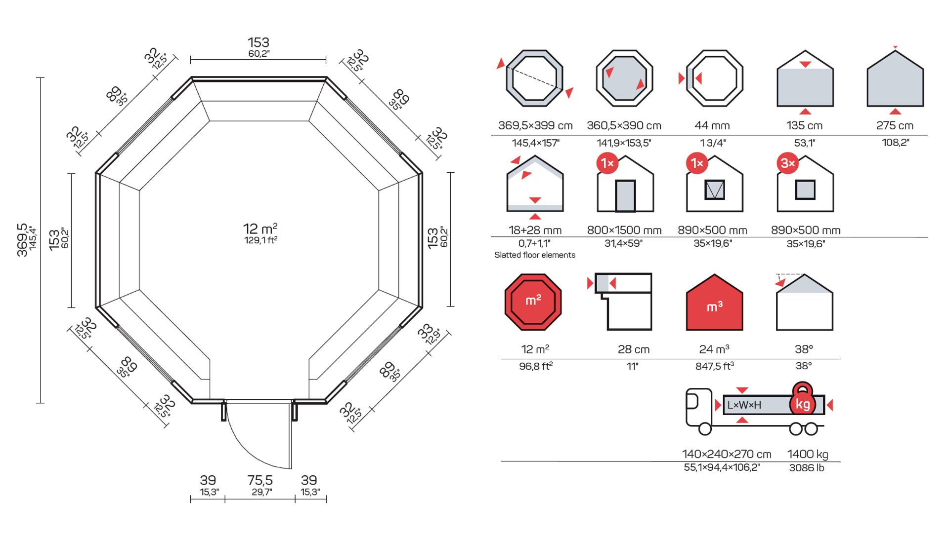 Vse lesene žar hiše 44 mm, vsebujejo standardni komplet: vrata, okna in opremo za