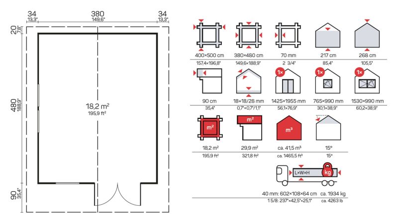 Vse 70 mm lesene hišice, otroške igralnice, nadstreški za avtomobile, poletne hišice in garaže vsebujejo standardni komplet: vrata, okna in pritrdilne elemente, ki omogočajo enostavno in hitro montažo hišic.
