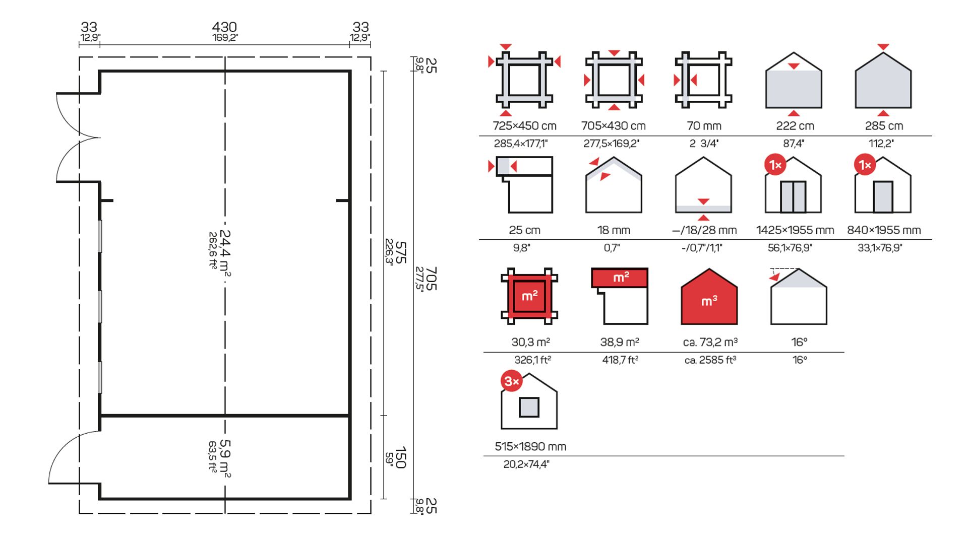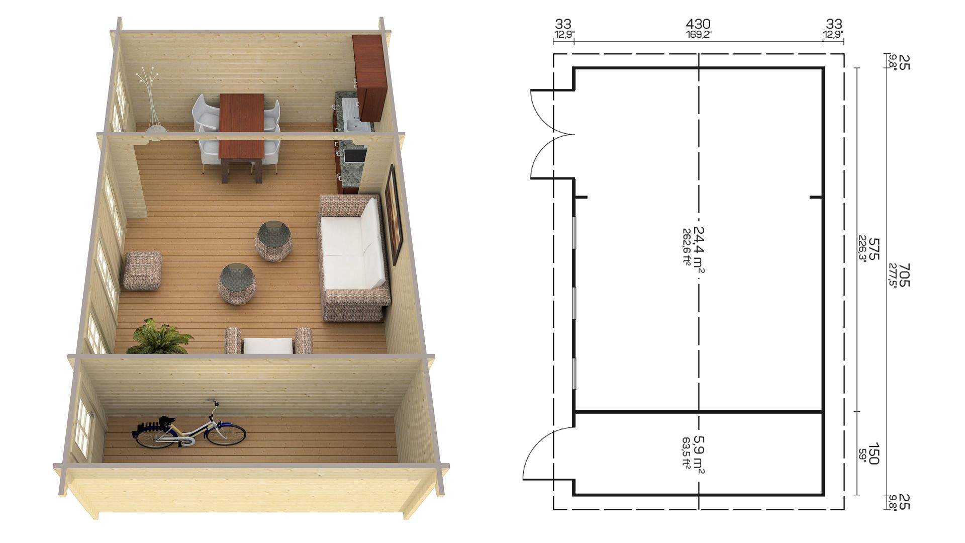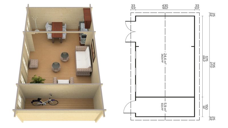 Lesena hiška Marida debeline 70 mm vsebuje:
