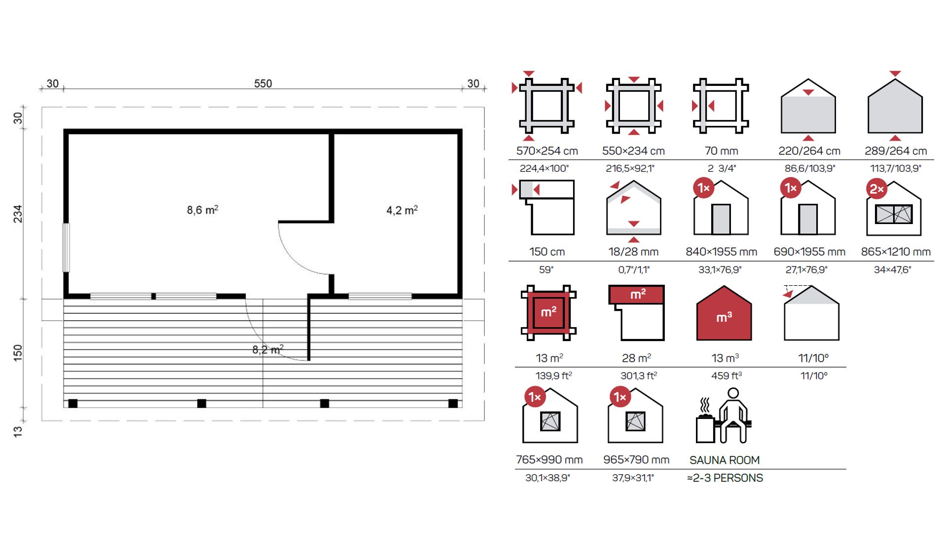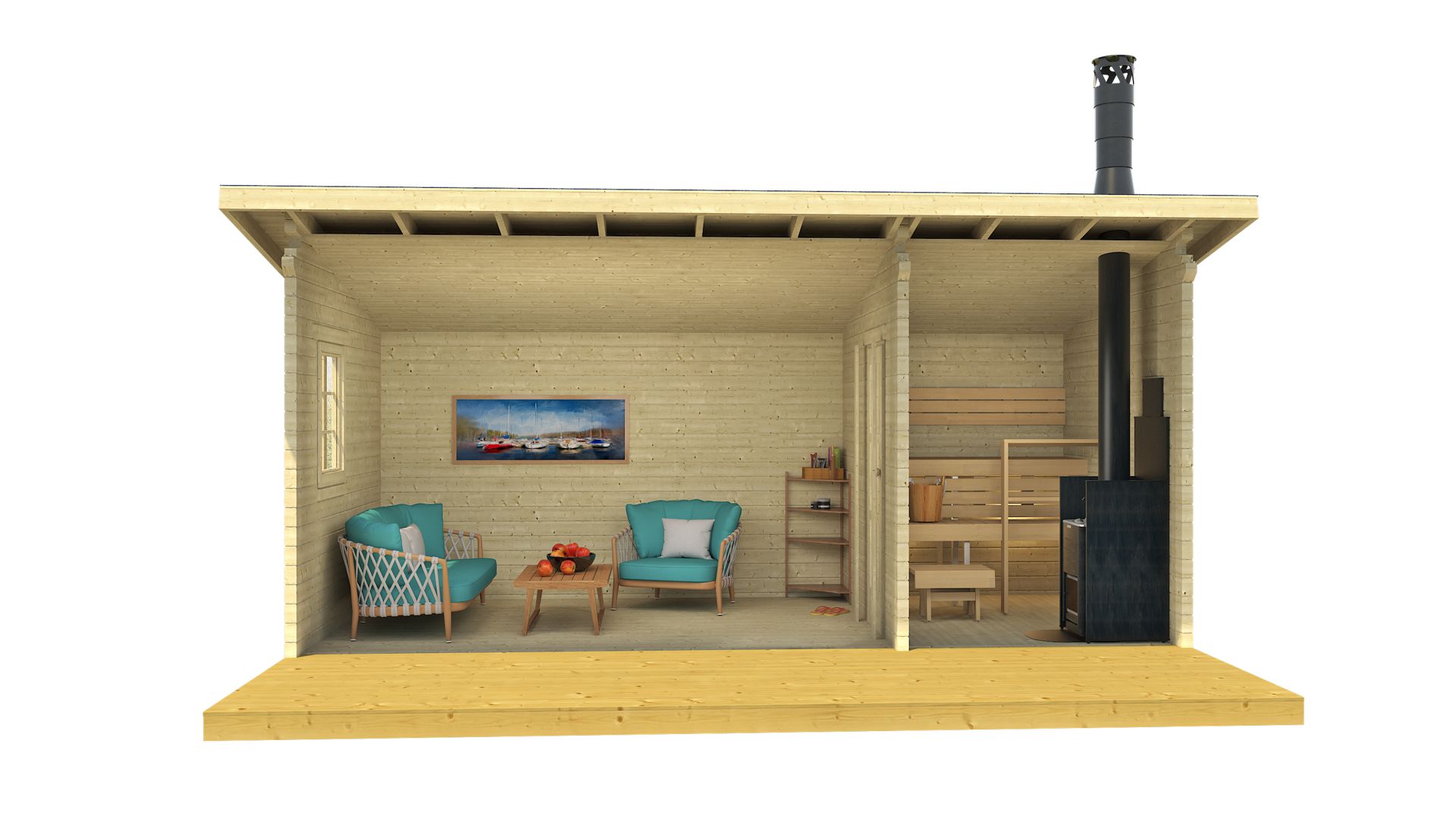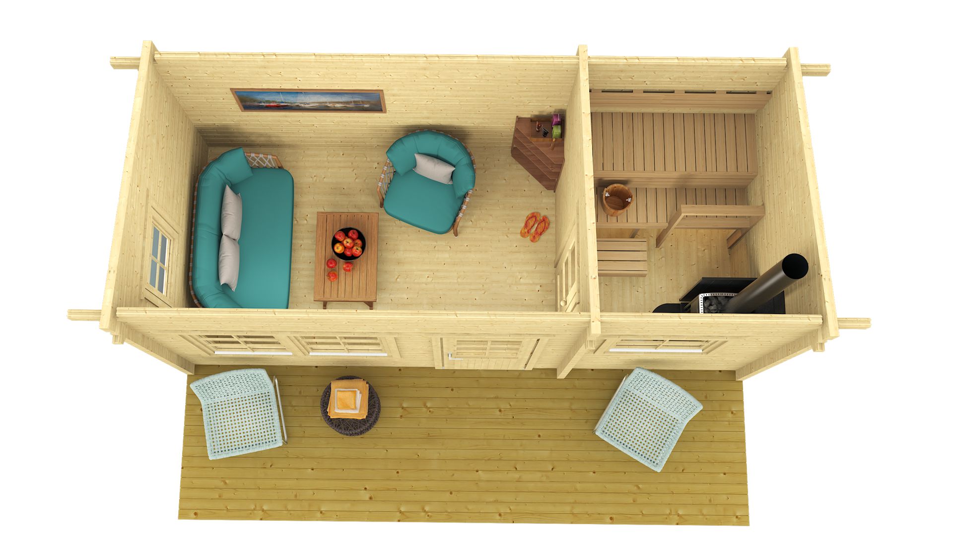 Komplet lesenih savn debeline 70 mm vsebuje: