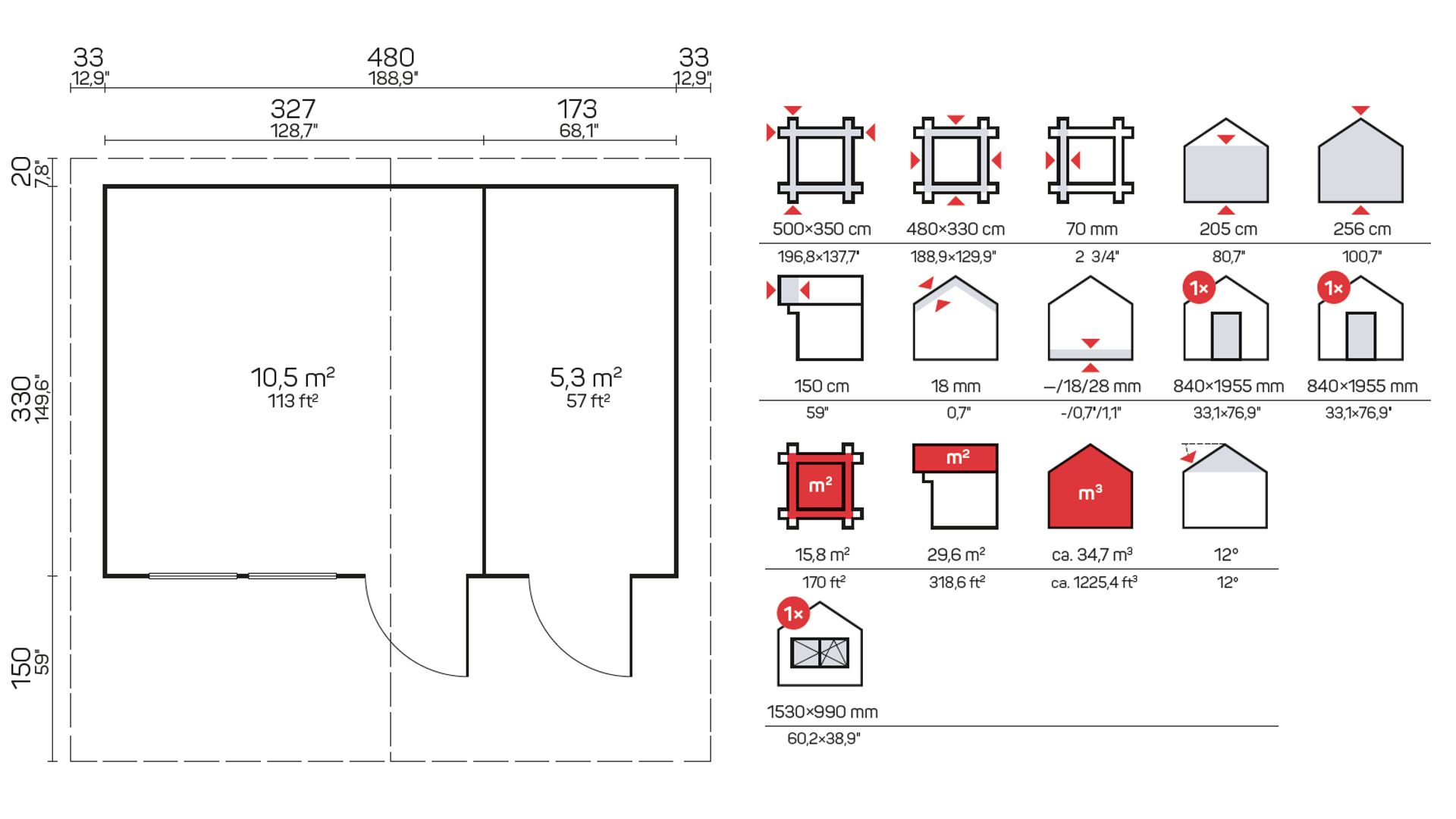 Lesena hiška Marida debeline 70 mm vsebuje: