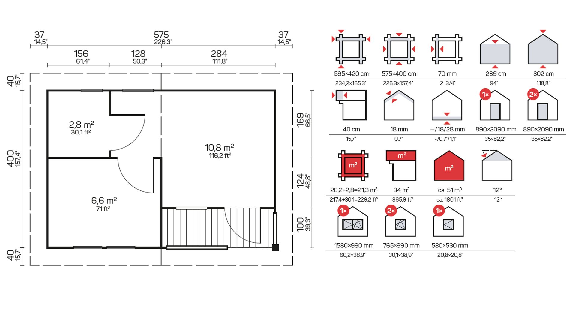Lesena hiška Marida debeline 70 mm vsebuje: