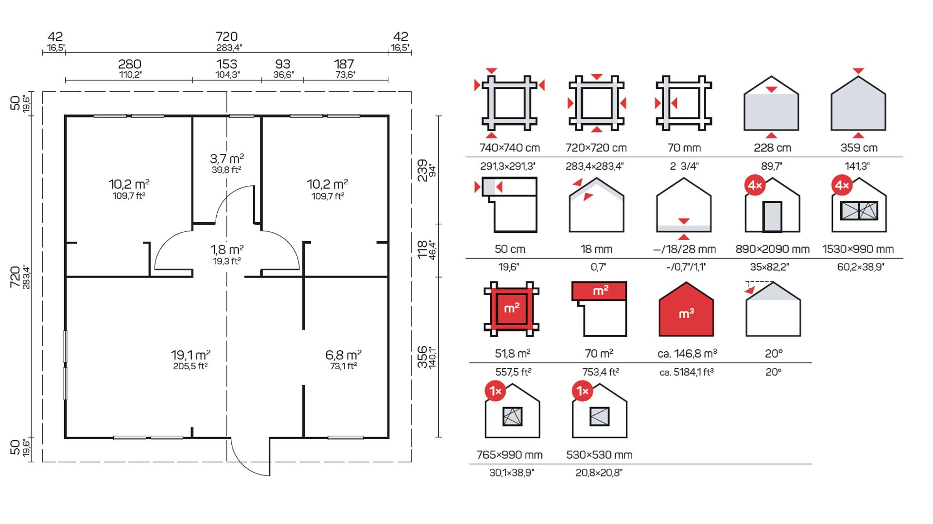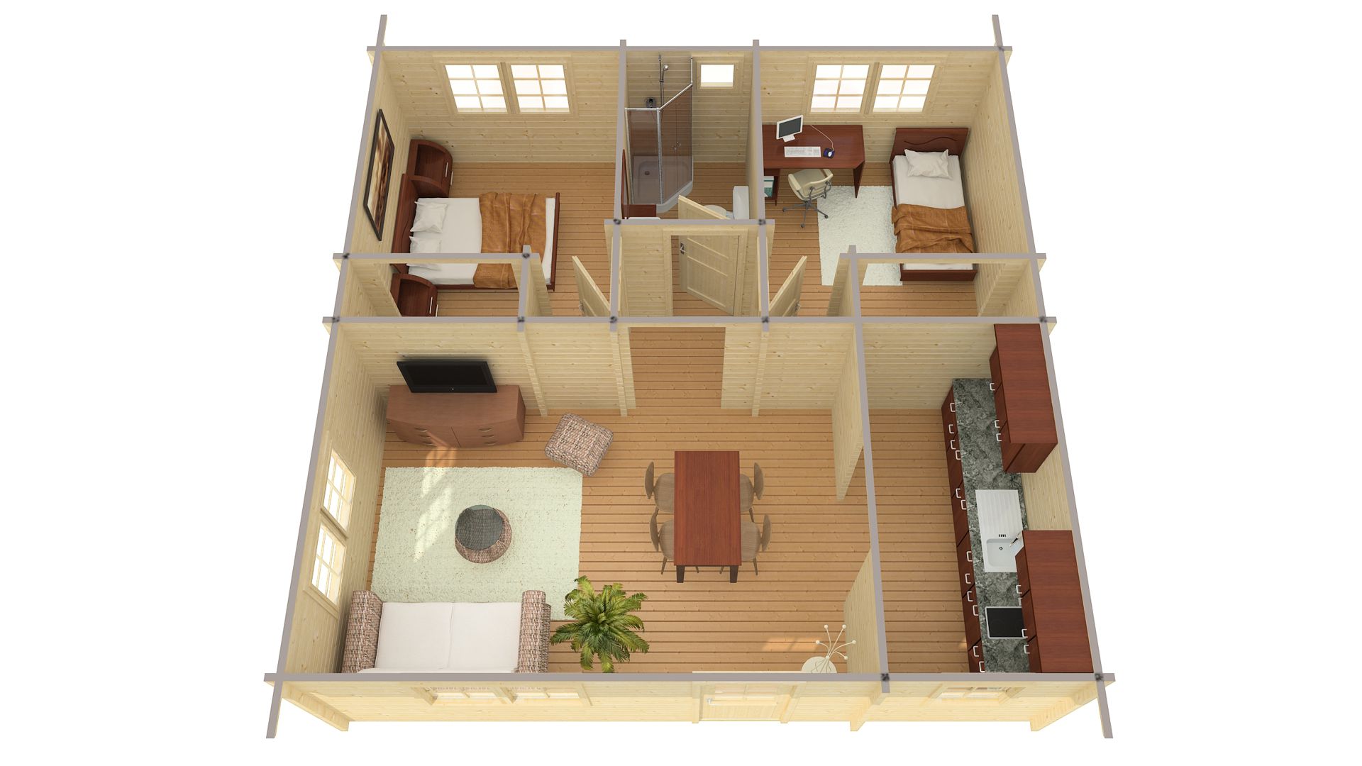 Lesena hiška Marida debeline 70 mm vsebuje: